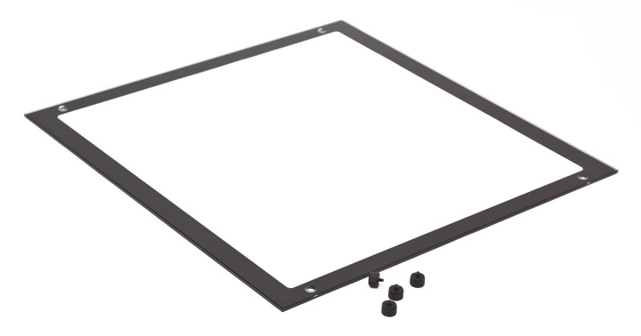 Стекло держится на четырех винтах с накатанной головкой, на обратной стороне которых есть резиновые прокладки. Одевается на стойки, к которым тоже приклеены демпферы. Вентиляционная решетка сделана не ровно, а слегка утоплена вглубь, в месте контакта с кромкой стекла, вероятно, для упрощения его снятия.