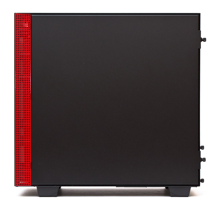 Правая боковая панель сплошная и металлическая, держится на двух винтах с накатанной головкой. Тип открывания — гильотинный. В передней части корпуса с этой стороны тоже сделана металлическая вентиляционная решетка красного цвета.