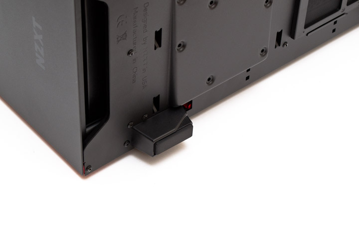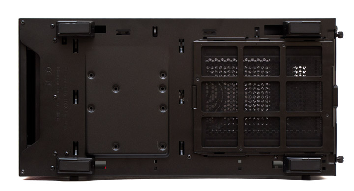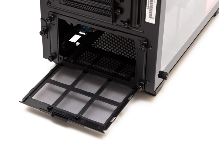 Для блока питания предусмотрена съемная монтажная рамка, которая держится на четырех винтах с накатанной головкой. Благодаря этому блок питания легко извлекается со стороны задней панели, и его можно ориентировать как вентилятором вверх, так и вниз. Снизу есть выдвижной пылевой фильтр, закрывающий БП. Он выполнен из сетки, наклеенной на пластиковую рамку.