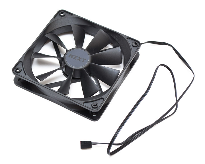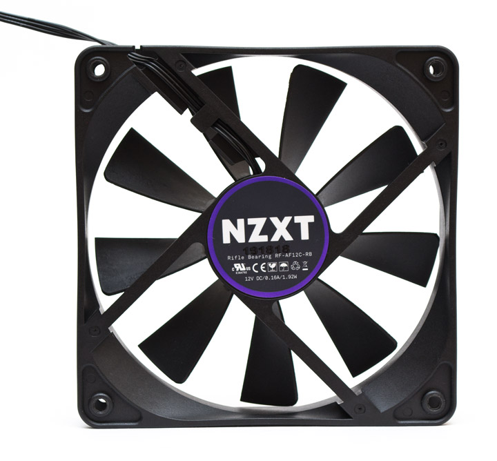 Вентилятор относится к серии NZXT Aer F120, буква F в нем указывает на конфигурацию лопастей крыльчатки, рассчитанную на то, чтобы создавать больший воздушный поток. Девять лопастей, почти прямые в профиль, расположены под большим углом атаки. В качестве подшипника тут используется нарезная втулка (в розничных вентиляторах — гидродинамических подшипник). Двигатель достаточно тихий, без посторонних шумов. Стартовать пропеллер способен с 600 обмин при 3 В и 34 дБ (А) шума, то есть практически бесшумно. На 700 обмин при 5 В и 36 дБ (А) он все еще тихий. На 900 обмин при 7 В и 40 дБ (А) он становится различимым на фоне системы. Полная скорость составляет 1200 обмин при 12 В и 49 дБ (А), тут слышен аэродинамический шум лопастей без призвуков со стороны двигателя.