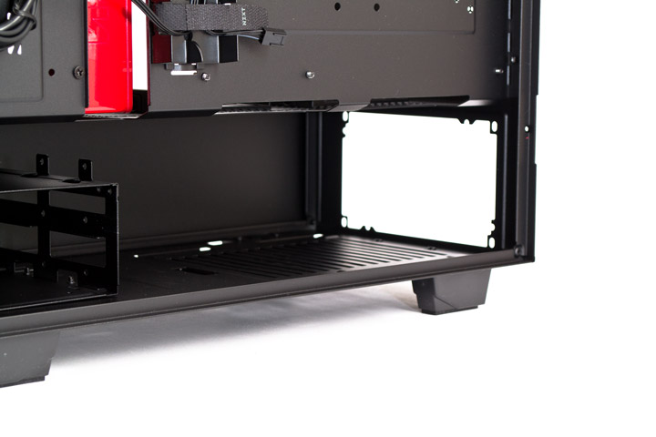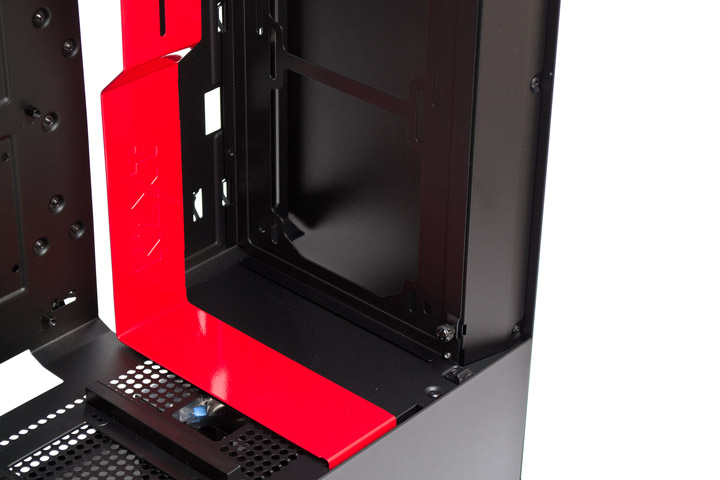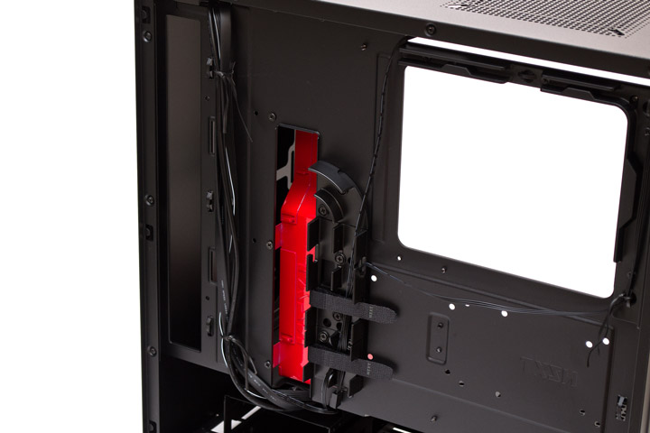 Посередине, ближе к передней части корпуса, установлена изогнутая красная металлическая планка, которую можно снять при необходимости. Они выполняет две задачи: прикрывает отверстия для протяжки проводов по центру, а еще на нее вверху можно повесить резервуар системы СВО.