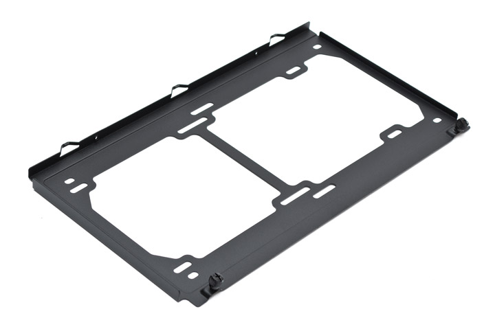 Поддон материнской платы выглядит обычно — вырез под усилительную пластину, проушины для кабельных стяжек, 23 мм пространства по ширине для укладки проводов, и так далее. Но и на нем есть несколько нетривиальных решений.