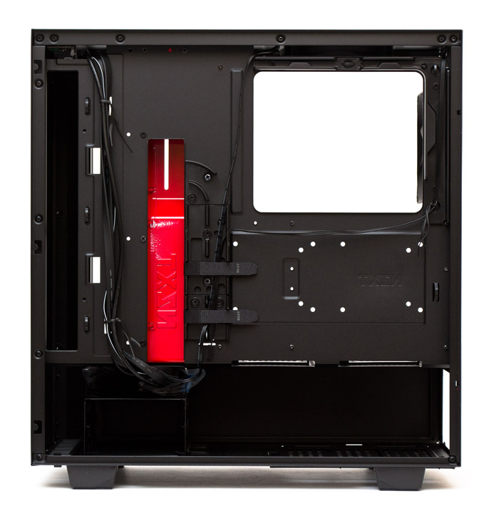 Через прозрачное боковое стекло отлично просматривается все содержимое корпуса. Для тех, кто любит рассматривать свою систему по ночам, NZXT даже сделали отдельную модель этого шасси — H500i с интегрированной подсветкой и хабом управления вентиляторами. Но на 30 долларов США дороже.