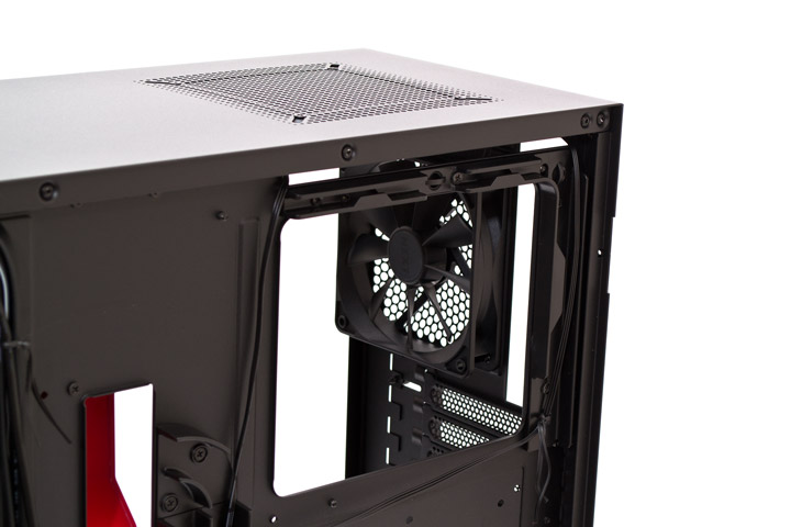 Верхняя панель ровная и металлическая. В ее задней части есть вентиляционная решетка с круглыми мелкими отверстиями, прикрытая изнутри еще более мелкой металлической сеточкой. На эту решетку можно установить один 120- или 140-мм вентилятор.