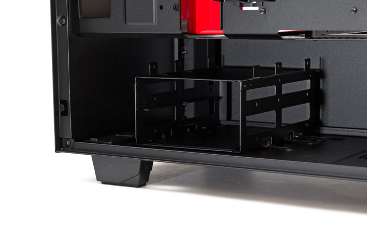 В верхней части кожуха блока питания сделана массированная перфорация. Кроме того, тут есть три отверстия для протяжки проводов и две пластиковые корзины для монтажа 2,5″ накопителей. Чтобы снять их, нужно нажать на подпружиненную пластиковую боковину корзины с правой стороны.