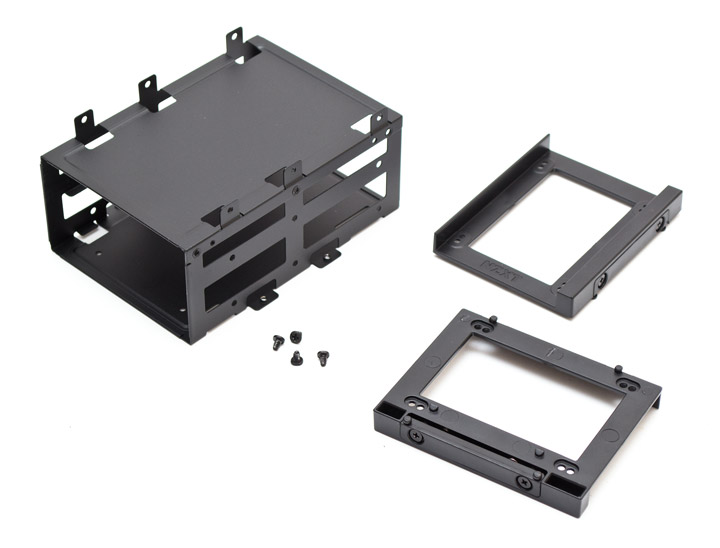 Корзина для дисков вызвала легкое разочарование своей простотой. Точнее, отсутствием салазок и необходимостью вывинчивать ее крепления снизу корпуса, чтобы иметь возможность закрепить сюда жесткие диски. На ее место можно поставить один 2,5″ или 3,5″ жесткий диск или помпы СВО типа DDC и D5.