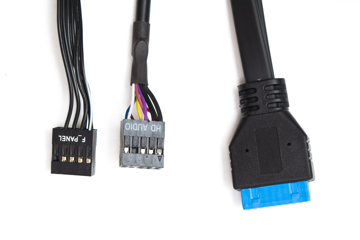 В перечень проводов входит всего три кабеля. Первый, который промаркирован как F_Panel, представляет собой спаренные и расположенные по Intel стандарту провода индикаторов питания и активности накопителей, а так же провод старта системы. До этих пор такое решение мне попадалось лишь в корпусах Lian Li. Удобно, но если расположение контактов на материнской плате не стандартное, возникнут проблемы. Впрочем, судя по инструкции на официальном сайте, в будущих ревизиях все же планируется добавить переходник на раздельные провода. Вторая колодка это HD Audio, ну а третий разъем — USB 3.1, полностью совместимый с 3.0.