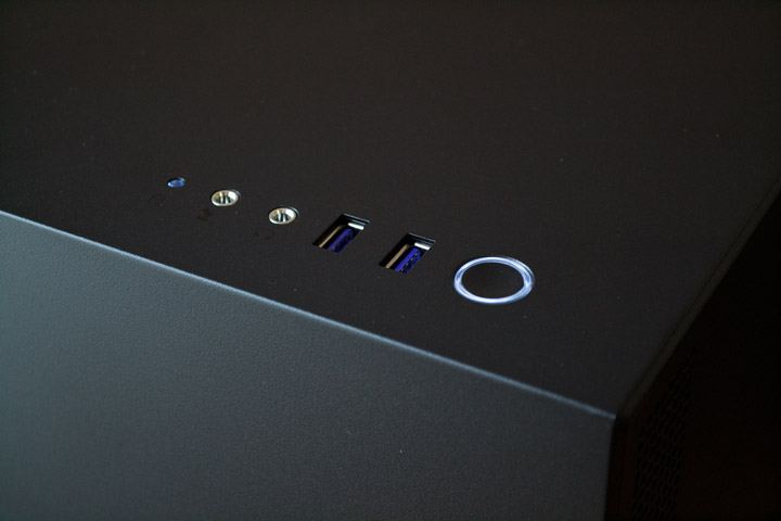 Внешние порты расположены справа, на передней грани верхней панели, которая является бесшовным продолжением фронта. Если смотреть слева направо, тут есть точечный индикатор активности накопителей, два 3,5-мм разъема аудио, два порта USB 3.1, окрашенные в фиолетовый цвет и круглая клавиша запуска системы, по периметру которой встроена полоска индикатора питания. Кнопка перезагрузки отсутствует.