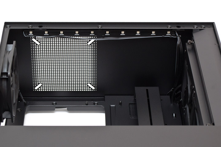 Кожух блока питания имеет обильную перфорацию и в большей мере выполняет декоративную функцию, нежели разделяет тепловые потоки между собой. Для протяжки проводов тут есть два больших и одно маленькое отверстие.