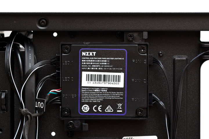 «Сердце» или точнее, главная интеллектуальная составляющая корпуса закреплена вверху слева. Это хаб второго поколения для управления RGB подсветкой и скоростью вентиляторов. А еще в нем встроен микрофон для измерения уровня шума. Справа на хабе есть три порта для вентиляторов с ШИМ-управлением, а в комплекте есть и разветвитель с одного на три четырехконтактных разъема. Слева находится два разъема для подключения подсветки, кабель питания и подключения к материнской плате.