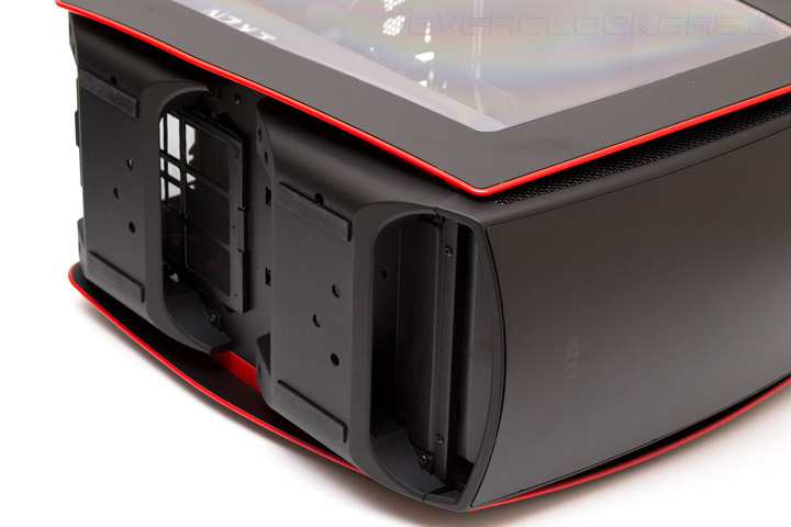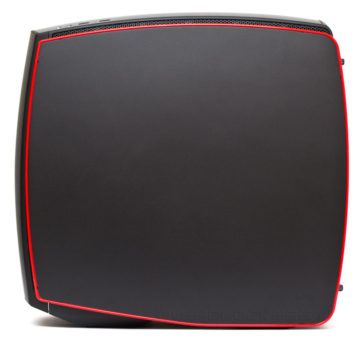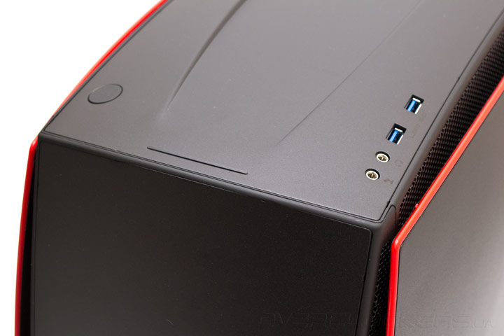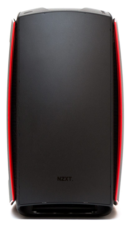 Как уже упоминалось выше, корпус NZXT Manta отличается закругленными внешними панелями, потому, то, что читатель видит на этих фотографиях — соответствует действительности и вовсе не является следствием оптического искажения. Фронтальная панель является композитной — на пластиковое основание приклеена стальная пластина, что придает ей благородный вид. Спереди нет ничего, кроме небольшого и малозаметного логотипа NZXT внизу посередине. Вентиляционные отверстия расположены в боковых углублениях и снизу.