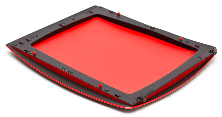 На левой боковой панели есть огромное округлое окно, сделанное из полностью прозрачного акрила. Передний нижний угол панели слегка «подрезан».