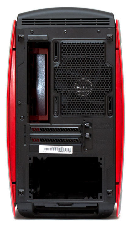 Задняя панель в целом выглядит стандартной. Вверху есть три щелевых вентиляционных отверстия. Решетка 120-мм вытяжного вентилятора расположена на своем привычном месте. Ее посадочные отверстия позволяют отрегулировать высоту положения пропеллера в пределах 30 мм. Слотов расширения всего два, они закрыты вентилируемыми многоразовыми заглушками, которые удерживаются специальной вертикальной планкой с двумя винтами с накатанной головкой. Малозаметная клавиша управления LED-подсветкой притаилась посередине левой грани, возле панели портов материнской платы.