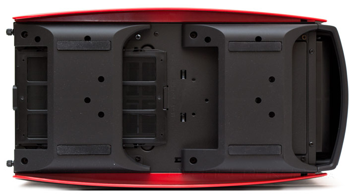 Корпус стоит на двух массивных пластиковых ножках округлой формы. Снизу на них надеты четыре резиновые крупные наклейки. А сквозные отверстия в днище корпуса и ножках нужны для привинчивания жестких дисков внутри шасси.