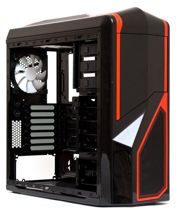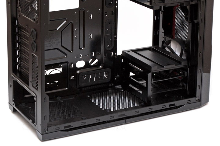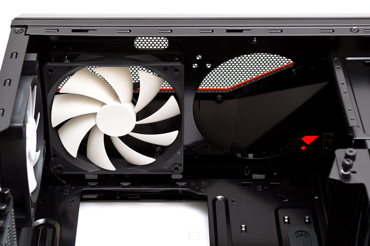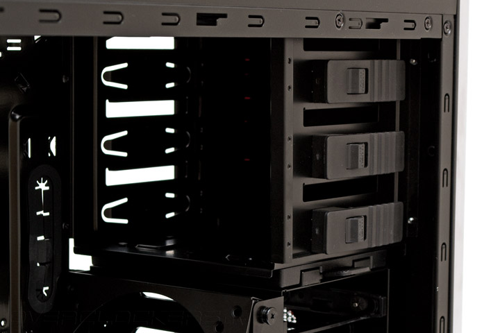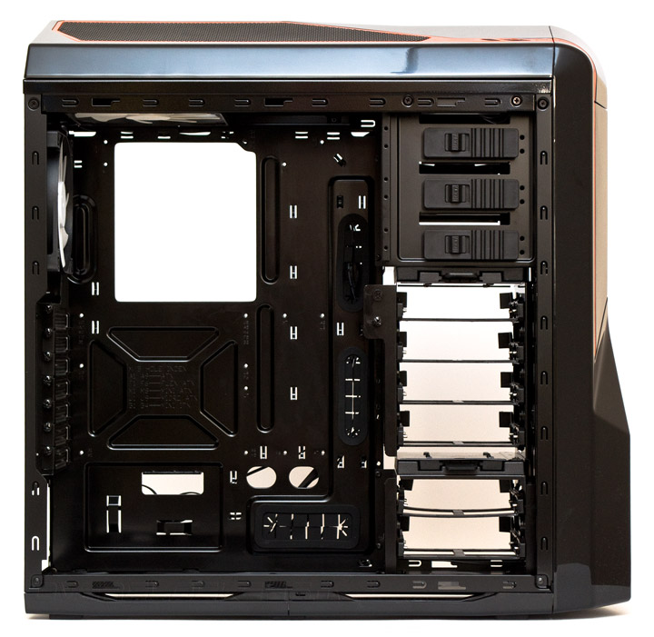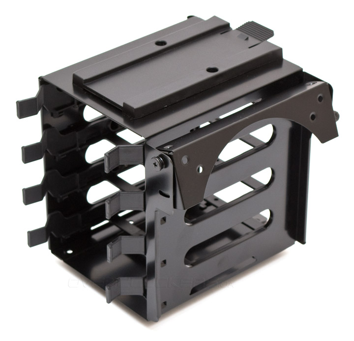 Салазки накопителей извлекаются по направлению назад, со стороны поддона материнской платы. На большой съемной корзинке установлено поворотное крепление для одного 120- или 140-мм вентилятора. Крепление уменьшает запас пространства для плат расширения до 280 мм напротив первого и второго слотов, и на все остальные слоты, в случае если этот внутренний пропеллер установлен. А если развернуть вентилятор под максимальный угол, пространство и вовсе уменьшится до 230 мм.