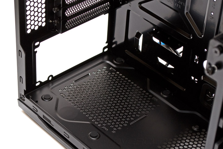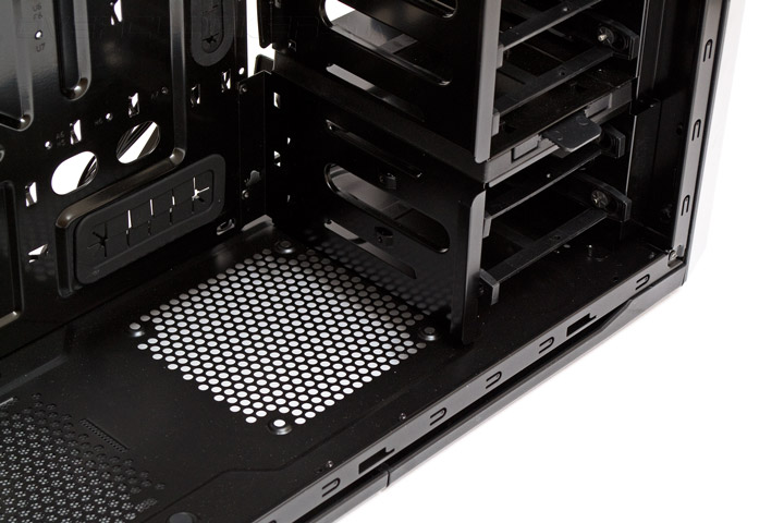 На нижней панели шасси есть два вентиляционных отверстия. Заднее предназначено для блока питания и закрыто сеточкой металлического фильтра. На решетку посередине можно установить 120-мм вентилятор, улучшив, таким образом, обдув плат расширения. Плохо лишь то, что фильтра на нем не предусмотрено.
