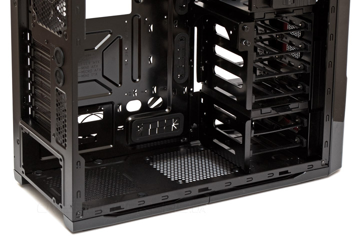 Обратную сторону поддона материнской платы вряд ли можно недооценить. Большой вырез под усилительную пластину кулера, три крупных прорезиненных отверстия для протяжки проводов, и еще пять отверстий поменьше, огромное количество проушин для крепления кабельных стяжек — одним словом тут есть все необходимое для успешной укладки всех кабелей, тем более что запас пространства за поддоном составляет целых 25 мм. Единственный обнаруженный недостаток в этой части шасси — резиновые шторки отверстий держатся очень ненадежно и постоянно выпадают при попытке протяжки даже небольшого кабеля.