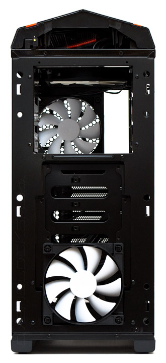 Задняя панель вполне стандартная. Вентиляционная решетка, состоящая из крупных сотовых отверстий, находится на своем привычном месте. Семь вентилируемых легкосъемных заглушек закрывают слоты расширения PCI. Справа от слотов есть два прорезиненных отверстия для шлангов СВО, а под ними еще одна мелкая вентиляционная решеточка. Посадочное место блока питания находится внизу и, судя по конфигурации отверстий, БП можно ориентировать как вентилятором вверх, так и вниз.