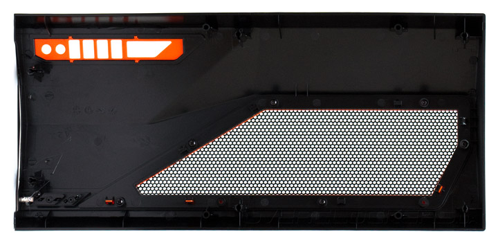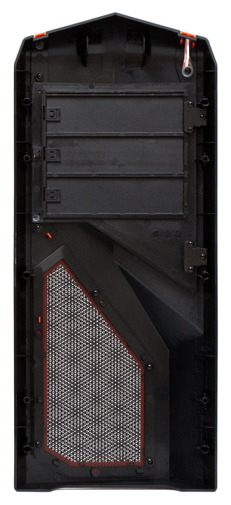 Так выглядит левая боковая панель с внутренней стороны. Ребра жесткости и неплохая толщина металла сообщают ей достаточную прочность. Сзади есть ручка для демонтажа, а два крепежных винта с накатанной головкой даже снабжены прокладкой, чтобы не царапать панель во время завинчивания. К сожалению, фильтр на вентиляционной решетке отсутствует.