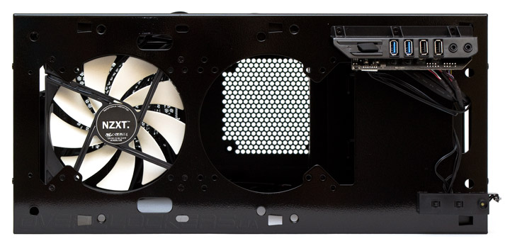 На задней панели мы находим предустановленный на вытяжку 120-мм вентилятор NZXT RF-FN122-RB основанной на втулочном подшипнике скольжения с винтовой нарезкой. Его крыльчатка способна стартовать с 3 В и 500 об/мин, не превышая уровень шума в 35 дБ (А). При 7 В (900 об/мин и 40 дБ (А)) бесшумность сохраняется. Максимальная скорость составляет 1200 об/мин при 46 дБ (А), что в целом тоже по шумности ниже среднего. Шнур питания трехконтактный. Особых призвуков данная модель не имеет, подшипник издает едва уловимое шуршание, а крыльчатка отзывается аэродинамическим шумом лишь на высоких скоростях вращения. Все заглушки слотов расширения, находящихся под вентилятором держатся на винтах с накатанной головкой. Кроме того, напротив них, в каркасе корпуса сделан вырез, чтобы отвертка заходила в винты под прямым углом без перекоса.
