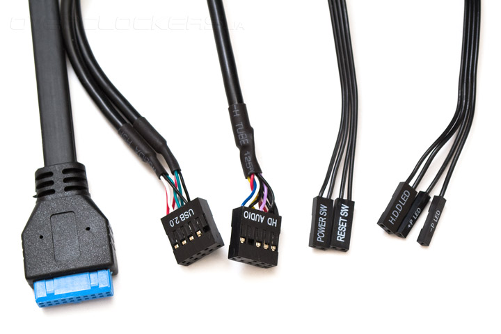 В набор кабелей входят колодка USB 3.0 и USB 2.0, провод HD Audio, и четыре стандартных провода от кнопок включения и перезагрузки системы, индикатора питания системы и индикатора активности накопителей.