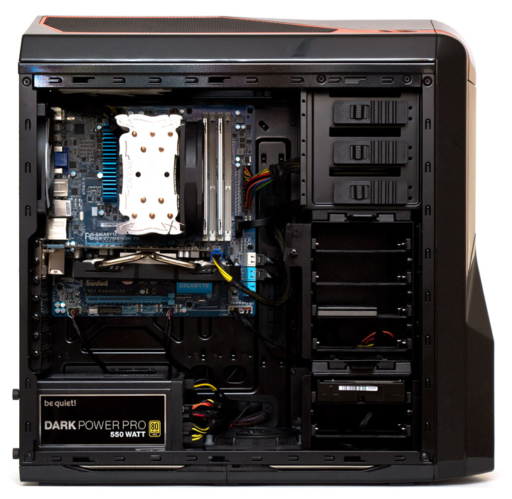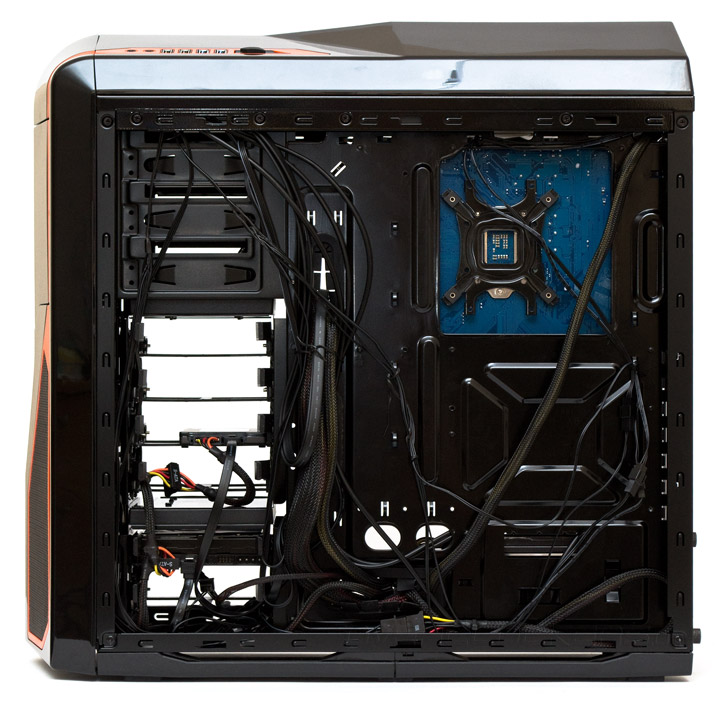 Сборка системы в корпусе NZXT Phantom 410 происходит просто и без проблем. Единственный момент, который вызвал у меня замечание, это протяжка кабеля питания процессора через соответствующее отверстие в верхнем правом углу. При установленном верхнем вентиляторе места там совсем немного и провод очень непросто протиснуть и подключить. В остальном все очень даже хорошо. Места внутри много, все кабеля укладываются за поддоном, и крышка закрывается без проблем. Вырез под усилительную пластину кулера совпадает с расположением современных процессорных разъемов.
