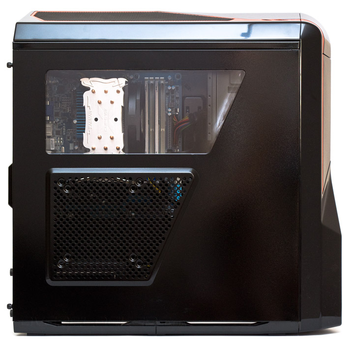 Левая боковая дверца имеет прозрачное акриловое окно в верхней части, врезанное заподлицо в панель и крупную вентиляционную решетку внизу, слегка выступающую над поверхностью. На решетке есть посадочные отверстия для установки одного 120- или 140-мм вентилятора.