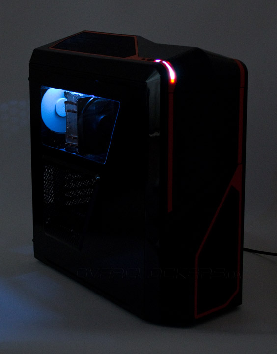 Подсветка верхнего вентилятора имеет белый цвет и создает интересный эффект «аквариума», что особенно ощущается в затемненном помещении. Индикаторы питания и активности накопителей, размещенные на левом переднем углу корпуса довольно яркие.