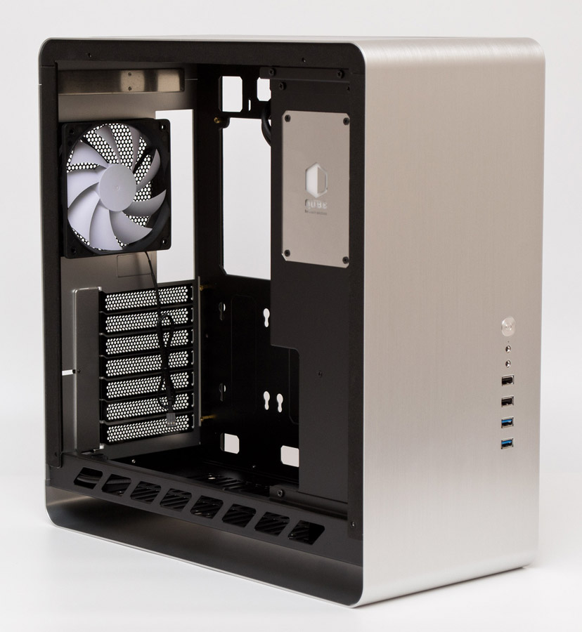 На задней панели предустановлен на вытяжку 120-мм вентилятор, работающий на постоянной скорости около 1200 об/мин и имеющий трехконтактный шнур питания в оплетке длиной 350 мм. Платы расширения во всех слотах крепятся обычными винтами. Предварительно потребуется снять декоративную планку напротив слотов PCI.