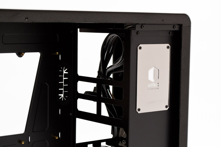 Место для блока питания предусмотрено в данном корпусе впереди сверху. Он располагается вертикально, причем исключительно в ориентации вентилятором по направлению внутрь корпуса. С внешней стороны кожуха БП на винтах закреплена зеркальная вставка с подсвечиваемым белым цветом логотипом Qube. Его питание осуществляется через разъем SATA Power. Данная пластинка является съемной и при желании вы можете ее заменить на свою собственную, тем самым немного кастомизировав корпус.