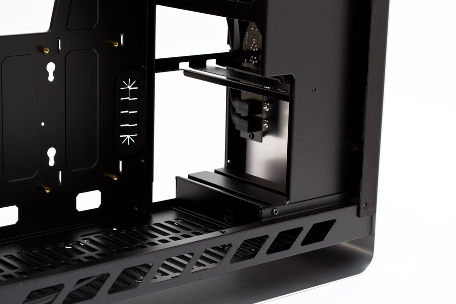 Внутренний каркас корпуса изготовлен из 1-мм стали и полностью окрашен в черный цвет. На нижнюю панель можно установить два 120-мм вентилятора, закрепив их с помощью длинных винтов. Радиатор СВО же можно альтернативно привинтить винтами с накатанной головкой снаружи. Вдоль нижнего бокового ребра жесткости проложен удлинительный силовой кабель от блока питания.