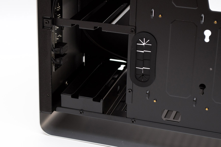 За поддоном материнской платы есть лишь 15 мм пространства до боковой панели для укладки проводов. Для усилительной пластины процессорного кулера сделан трапециевидный вырез вверху справа. Протяжку проводов можно осуществлять через два отверстия вверху, два центральных прорезиненных отверстия или три выреза снизу. Для крепления кабельных стяжек есть всего девять довольно узких и не особо удобных в плане расположения проушин. В нижней и задней части поддона есть набор отверстий, куда при помощи резиновых прокладок и винтов можно закрепить два 2,5″ накопителя.