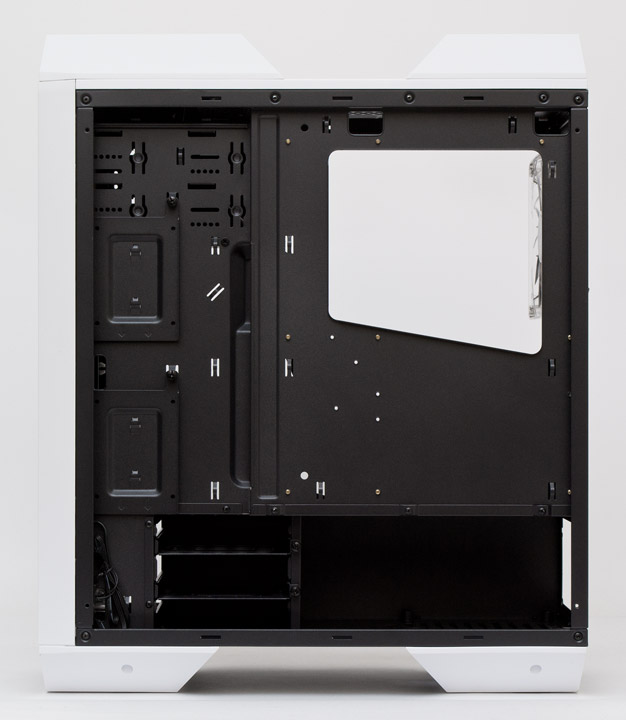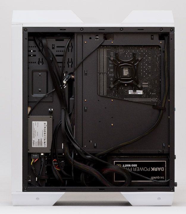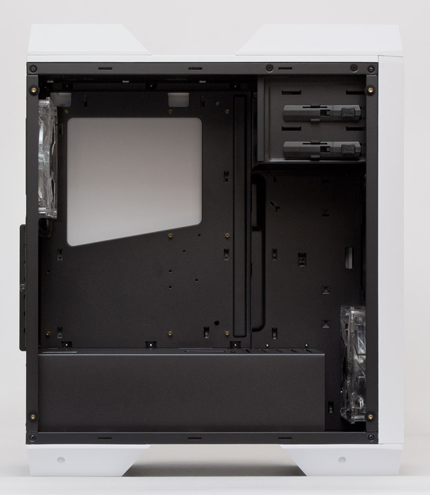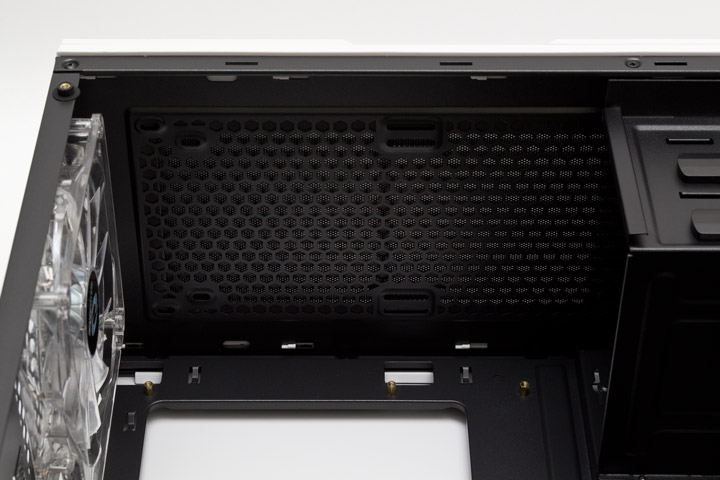 Поддон материнской платы сделан удобно. Имеет большой вырез под усилительную пластину процессорного кулера с загнутыми под прямым углом краями, что увеличивает его общую жесткость. Все стойки материнской платы уже вкручены в поддон под АТХ-формат. Для укладки проводов имеется длинное штампованное отверстие по центру и пара мелких квадратных прорезей вверху. Скобы для крепления кабельных стяжек расположены в подходящих местах. Запас пространства от поддона материнской платы до боковой панели составляет от 18 (сзади) до 28 мм (в передней части), чего обычно достаточно для нормальной укладки кабелей.