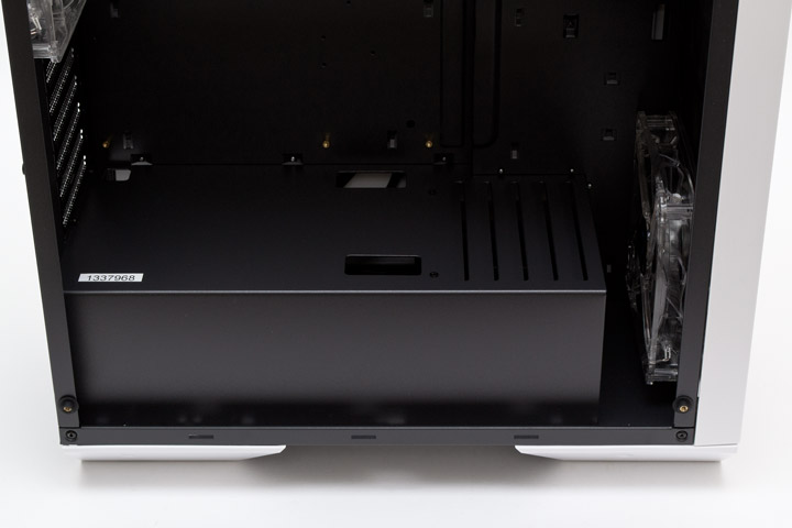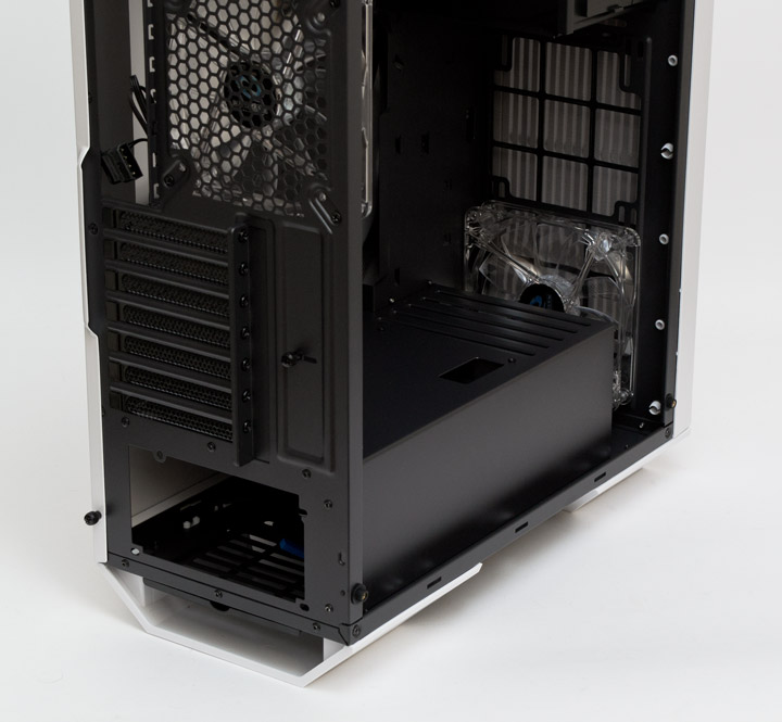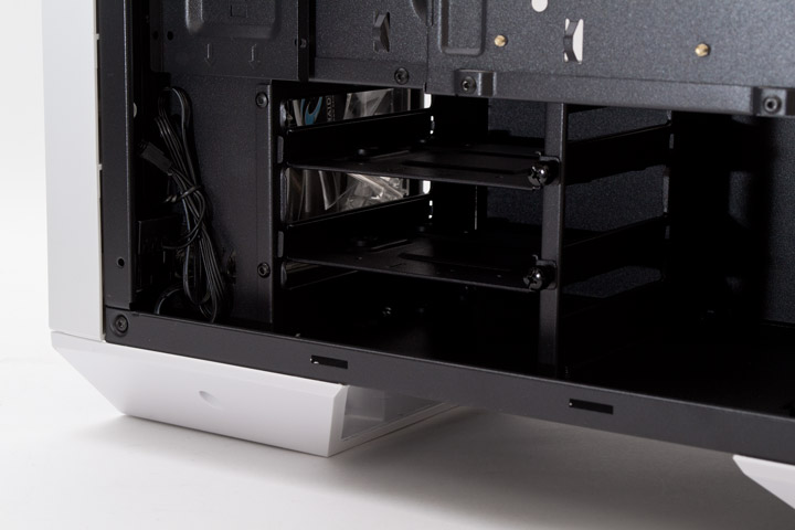 Внизу есть несъемный кожух, закрывающий собой блок питания и отсек накопителей. В нем по умному сделаны отверстия для протяжки аудио- и USB-кабелей, а так же шнуров питания видеокарты. В передней и верхней части кожуха есть щелевые вентиляционные отверстия для охлаждения дисков.
