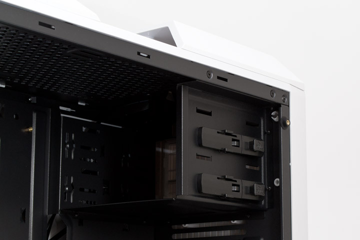 В передней верхней части корпуса есть съемная корзина для двух 5,25″ устройств. Быстрые фиксаторы с ее правой стороны выполнены в виде пластиковых качелей. Для демонтажа этой корзины понадобится в сумме выкрутить восемь винтов с разных сторон, после чего пользователь получит возможность поставить впереди радиатор СВО длиной до 360 мм.