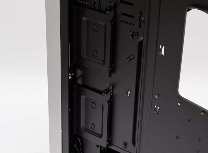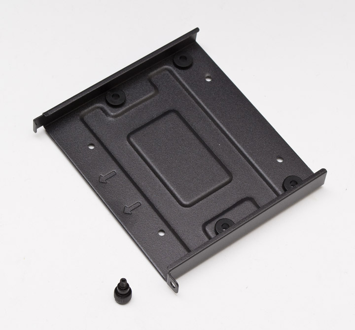 Лотки в корзине металлические, без вентиляционных отверстий, держатся на одном винте с накатанной головкой. В них можно закрепить винтами один 3,5″ или 2,5″ накопитель. В случае с 3,5″ жесткими дисками предусмотрены резиновые демпферы в отверстиях снизу.