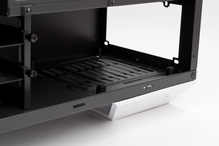 Пространство для блока питания ограничено по длине корзиной жестких дисков. Без проблем сюда можно поставить БП длиной до 180 мм включительно. Для более крупных источников питания нужно будет демонтировать стенку корзины. На дне корпуса для БП предусмотрено четыре пластиковые подставки с мягкими резиновыми нашлепками сверху.
