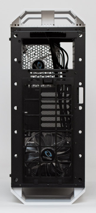 Задняя панель стандартная. Вверху есть вентиляционная решетка с предустановленным на вытяжку 140-мм вентилятором (есть посадочные отверстия и для 120-мм пропеллера). Слотов расширения семь, все закрыты многоразовыми вентилируемыми заглушками. Декоративная планка, закрывающая технологическое отверстие для монтажа карт расширения справа, держится на одном винте с накатанной головкой. Посадочные отверстия для блока питания позволяют ориентировать его лишь в одном направлении — пропеллером вниз.