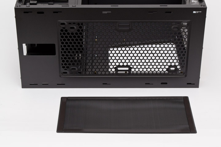 Посадочные места передних вентиляторов закрыты приличным пылевым фильтром в виде мелкой сеточки, наклеенной на пластиковую рамку. Он легко снимается и очищается. Но отверстия под 5,25″ устройства не закрыты ничем и есть вариант, что именно туда устремится часть потока воздуха, а вместе с ним и пыль.