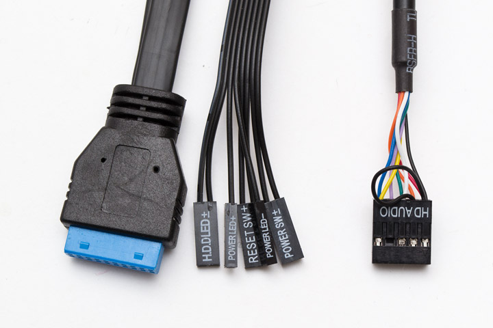 В набор черных проводов входит одна колодка USB 3.0, разъем HDAudio, стандартные кабеля черного цвета от индикаторов активности накопителей и питания системы, кнопки старта и перезагрузки ПК. Длина всех проводов достаточна для подключения к любым материнским платам.