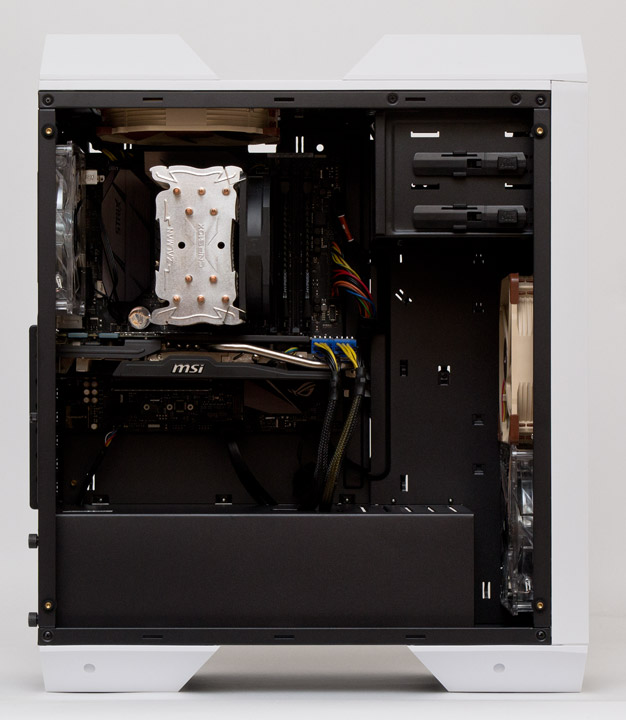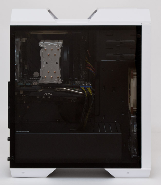 Зато боковое закаленное стекло слева выглядит очень красиво, позволяя увидеть всю внутреннюю начинку системы. Держится оно на четырех металлических винтах с накатанной головкой.