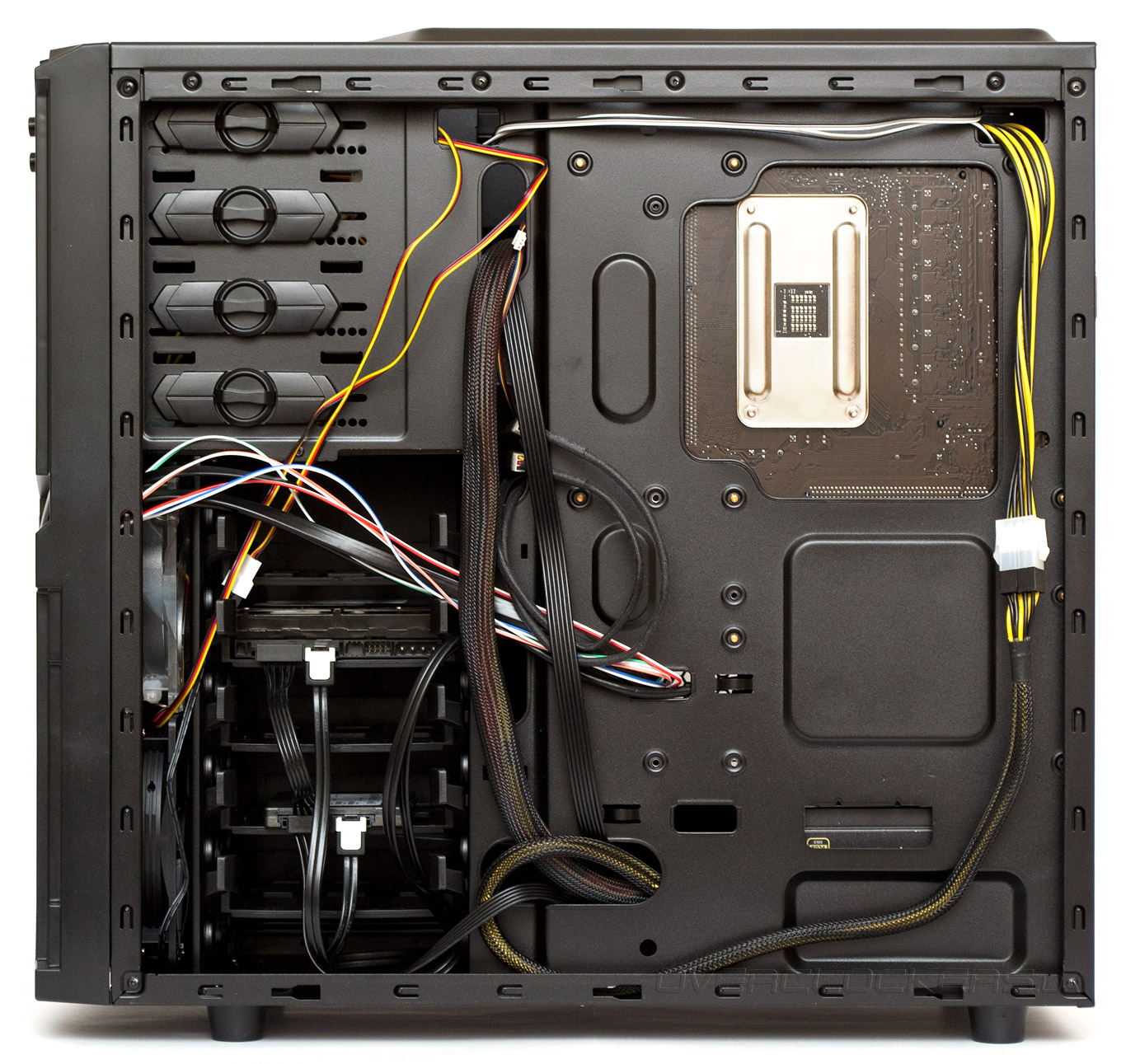 Что можно отнести к позитивным моментам? Прежде всего, хорошую общую жесткость шасси при использовании тонкого металла. Особенно умиляет внимание к деталям, если вспомнить о рекомендованной цене в 55 долларов. Системы безотверточного крепления устройств 5,25” действительно работают, доступ к ним очень прост. Накопители 3,5” и 2,5” надежно фиксируются на своих местах. Присутствует полный комплект пылевых фильтров. Все запчасти отлично подогнаны друг к другу, за поддоном много места для укладки проводов, а сам поддон имеет все необходимые отверстия в нужных местах. Ножки приподнимают шасси на достаточную высоту для хорошей вентиляции блока питания. И нет, практически, не единой лишней детали.