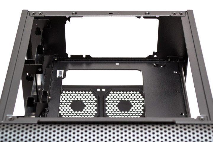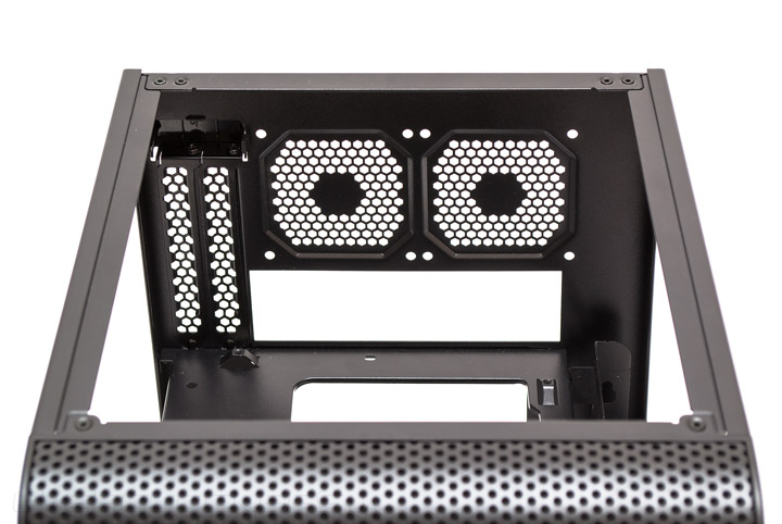 На заднюю панель верхнего отсека можно установить два 80-мм вентилятора. Однако стоит учитывать, что на материнских платах Mini-ITX формата редко встречается больше одного разъема питания для корпусных пропеллеров. Заглушки слотов PCI держатся на обычных винтах, прикрытых декоративной пластиковой накладкой.