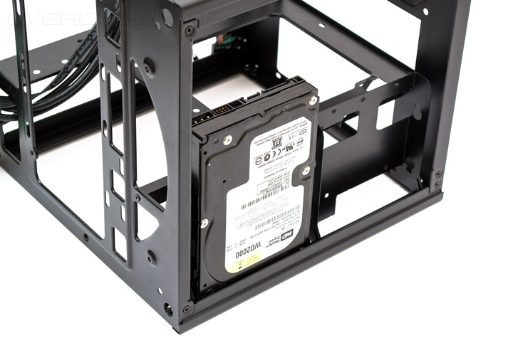 Две корзины накопителей крепятся вертикально в правой части корпуса. Каждая удерживается всего одним обычным винтом. Нужно признать, что место для них подобрано очень удачно — тут получается наиболее холодная зона шасси, обдуваемая к тому же крупным передним вентилятором.