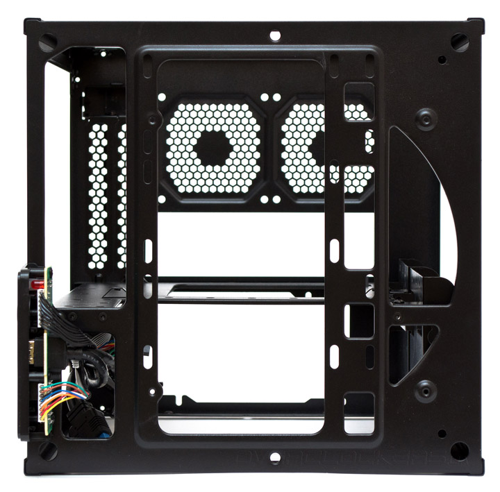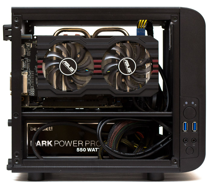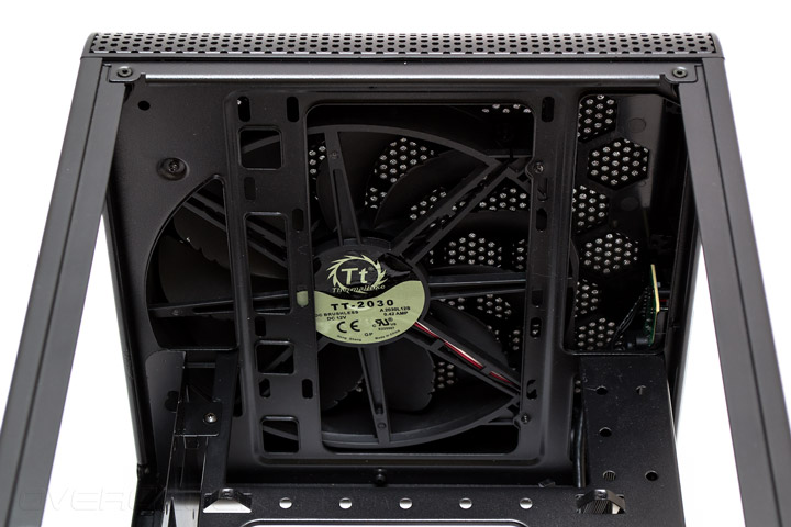 Поскольку верхняя, нижняя и обе боковые панели снимаются, доступ ко всем внутренним компонентам Thermaltake Core V1 обеспечивается со всех сторон. Это очень удобно как при сборке, так и при обслуживании шасси. Корпус поддерживает установку в горизонтальном положении материнских плат исключительно формата Mini-ITX. Максимальная допустимая высота процессорного кулера составляет 140 мм. Возможная длина плат расширения достигает 255 мм в пределах корпуса или 285 мм, если карта выходит в пространство передней панели. Допустимая длина стандартного блока питания — до 200 мм включительно.