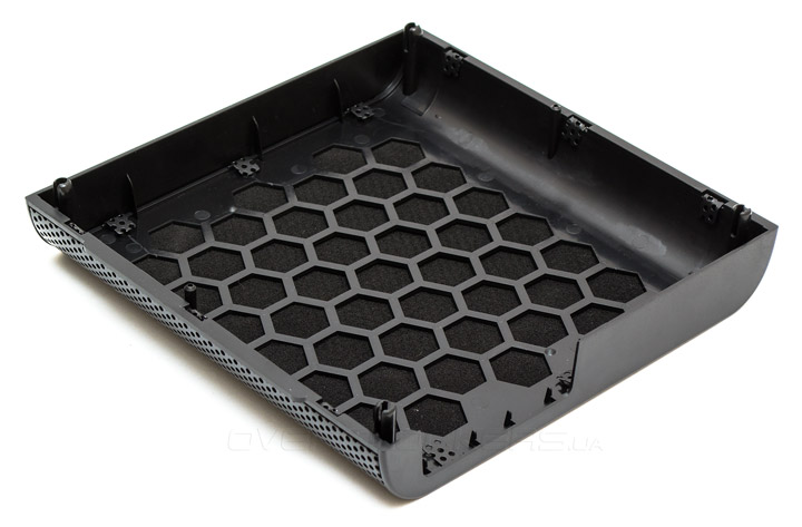 Так выглядят съемные панели корпуса с обратной стороны — верхняя, нижняя и две боковые (они идентичны между собой, потому вторую на фотографии не приводим). Все панели достаточно прочные на изгиб, благодаря ребрам жесткости и небольшому размеру. Пластиковые ножки, как видим, держатся на обычных защелках, а акриловое окно закреплено с помощью изогнутых металлических лепестков. Все дверцы имеют гильотинный тип открывания, то есть, снимаются сразу в сторону, без сдвигания назад.