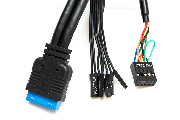 В набор проводов входит колодка USB 3.0, стандартные провода от кнопок старта и перезагрузки системы, индикаторов активности накопителей и подачи питания, кабель HD Audio. Все они черного цвета и имеют более чем достаточную для комфортного подключения длину.