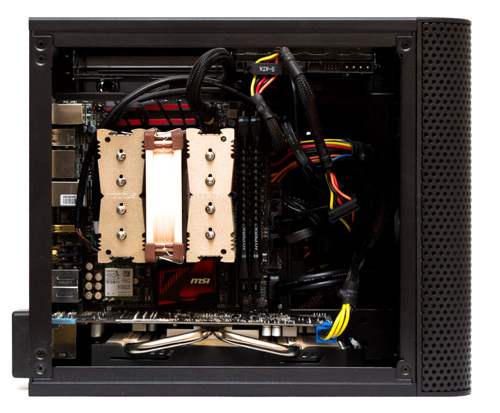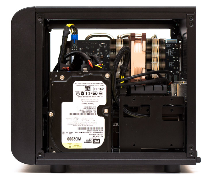 Внутренний объем корпуса условно поделен поддоном материнской платы на две части — верхнюю и нижнюю. Верхняя предназначена для материнской платы и видеокарты. Нижняя часть практически полностью занята блоком питания и проводами от него.