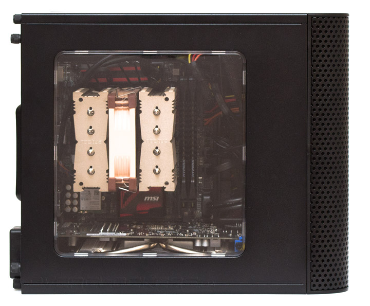 Конфигурация задней панели прямо указывает на горизонтальное размещение материнской платы внутри. Сверху есть две посадочные решетки для двух 80-мм вентиляторов. Два слота расширения, закрытые многоразовыми вентилируемыми заглушками находятся вертикально справа. Крепления заглушек прикрыты декоративной пластиковой вставкой. Блок питания располагается горизонтально снизу.