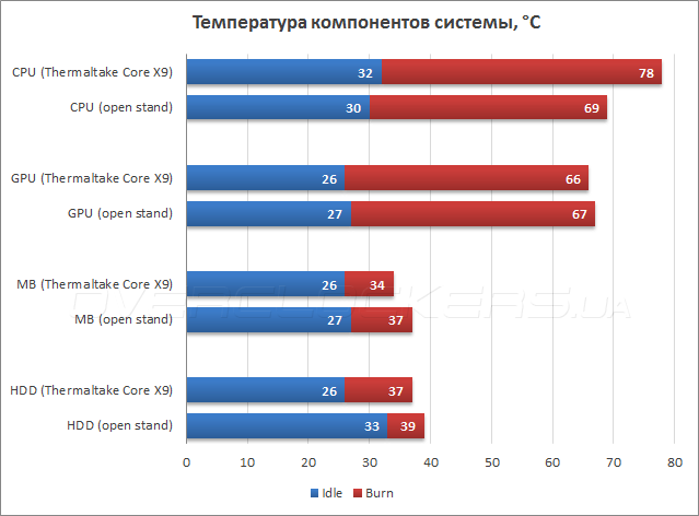 Тепловая нагрузка создавалась с помощью одновременной работы стресс-тестов LinX 0.6.5 с 2048 МБ выделенной памяти и MSI Кombustor 2.5 на протяжении 10 минут после стабилизации температуры. Нагрузка на жесткий диск производилась программой Crystal Disk Mark 3.0.3 х64. В конце цикла тестирования система работала 10 минут в холостом режиме для определения минимальных тепловых показателей. Температура окружающей среды равнялась 24 градусам Цельсия. Скорости вентиляторов процессорного кулера и видеокарты зафиксированы на максимальных оборотах. Пиковое энергопотребление системы составило 373 ватта. Тестирование проводилось в единственном режиме сравнения с открытым стендом. Скорость стоковых бортовых вентиляторов была установлена на максимум — 1000 об/мин для 120-мм и 800 об/мин для 200-мм пропеллера.